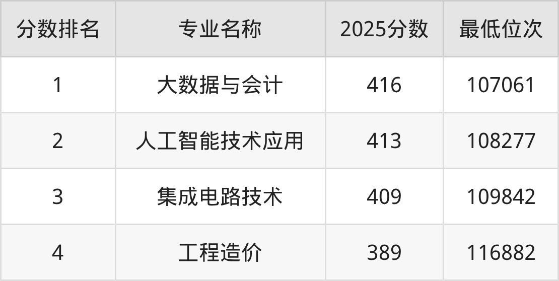 成都职业技术学院2025年在重庆高考物理类,收分最高的王牌专业是大数据与会计,考生至少需要416分、107061位才能被录取。