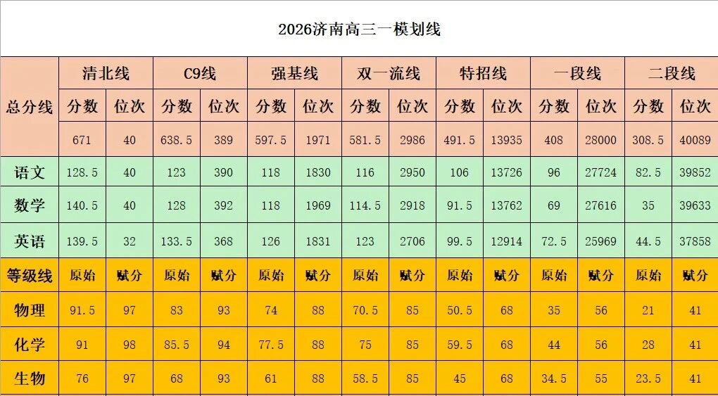 2026山东济南一模分数线已公布,其中清北线为671分,特招线491.5分,本科线408分,专科线308.5分。同时,本文还整理了2026山东济南一模的一分一段表及省排名换算方法,供考生和家长参考。