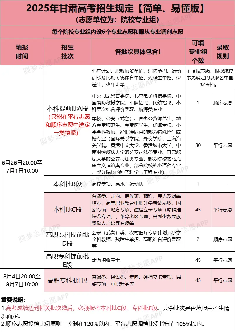 2026年甘肃高考志愿根据录取批次和招生类型进行设置,主要分为本科提前批、本科批和高职(专科)批,各批次下设不同段落,志愿设置呈现多样化。