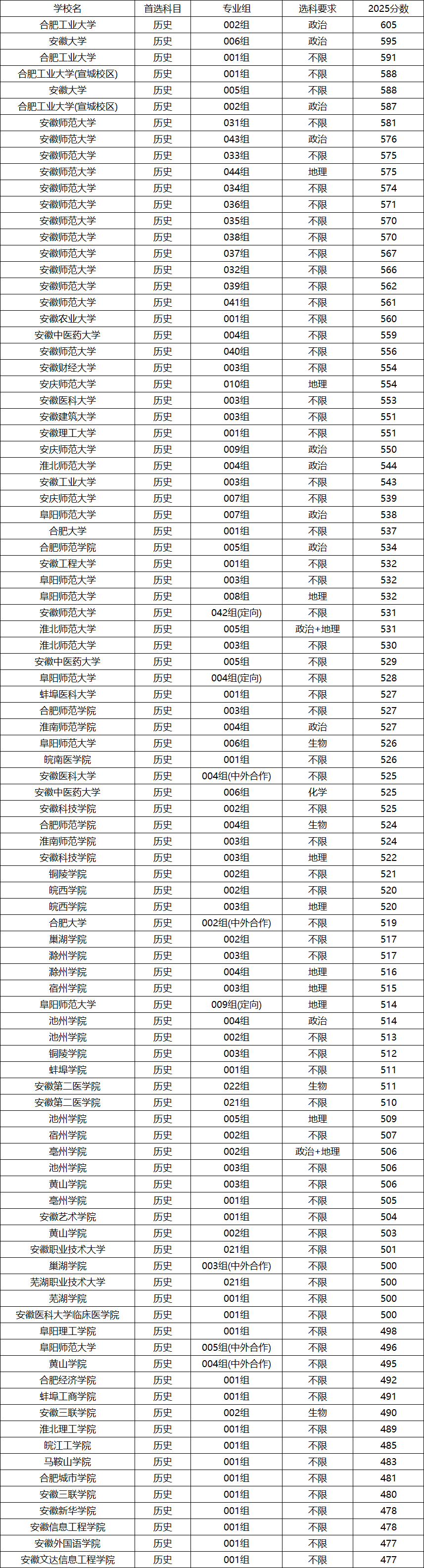 安徽有哪些文科大学可以报考?本文将为2026年安徽省内历史类高考生展示:安徽文科大学排名及2025年最低录取分数线,具体为477分~605分。