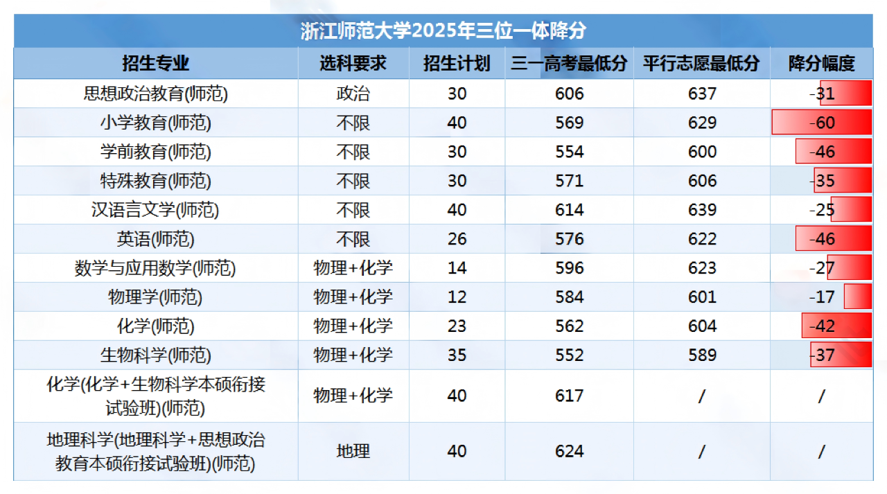 2025年浙江师范大学三位一体招生覆盖12个师范类专业(含复硕培养试点),各专业三一高考最低分均低于平行志愿最低分,降分幅度在17-60分之间,具体如下: