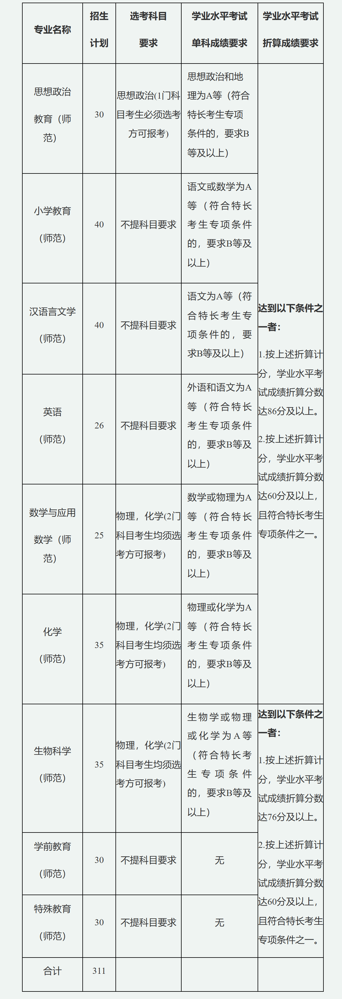 学业水平考试等第折算为满分100分:A等计10分,B等计8分,C等计6分,D等计2分。部分专业如生物科学要求折算分达70分以上。