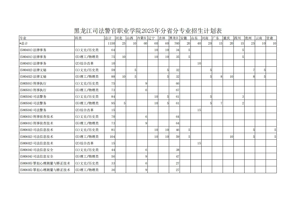 黑龙江司法警官职业学院招生计划分为提前批司法行政警察类专业和专科批普通类专业。参考2025年该校总招生计划为1150人,其中: