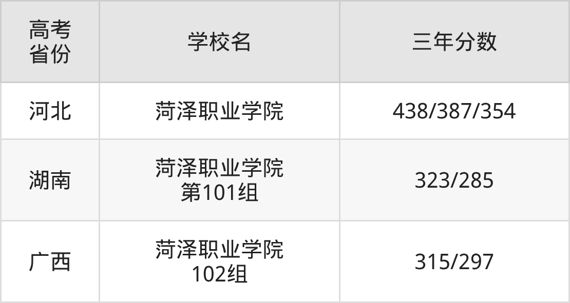 下方表格展示的是菏泽职业学院在山东考生中招生时,近三年的最低录取分数线汇总: