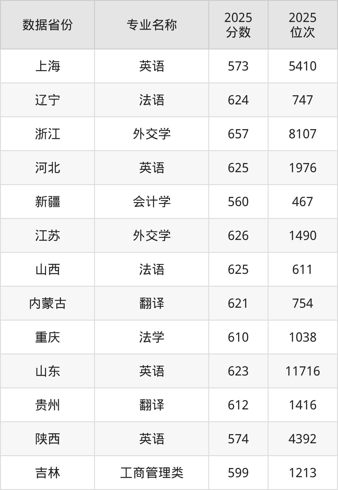 历史类热门专业包括英语、法语、外交学、会计学、翻译、法学、工商管理类,全国多省最低录取分均在560分以上,报考竞争力较强。上海外国语大学各省历史类热门专业录取分数线及位次如下: