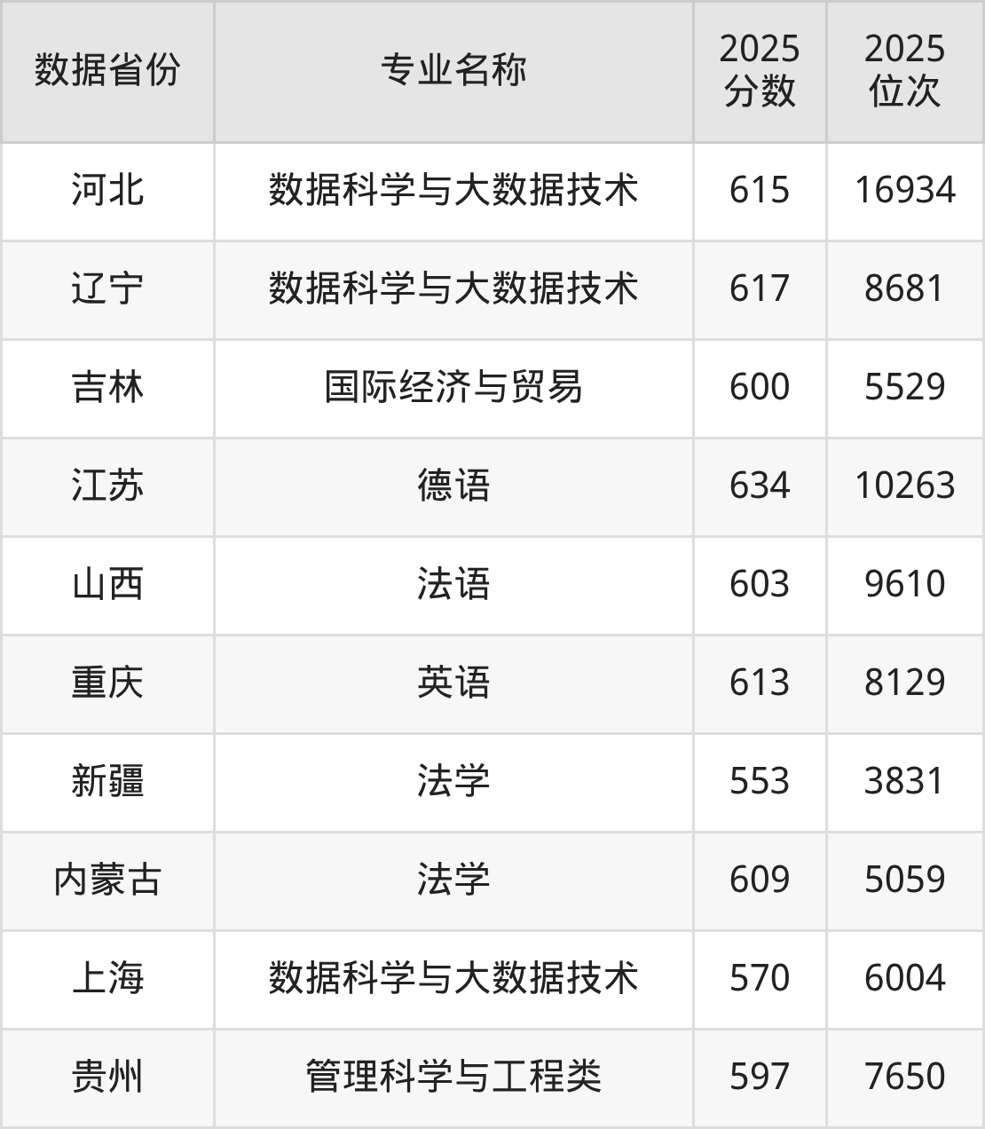 物理类热门专业包括数据科学与大数据技术、国际经济与贸易、德语、法语、英语、法学、管理科学与工程类,全国多省最低录取分均在550分以上,报考竞争力较强。上海外国语大学各省物理类热门专业录取分数线及位次如下:
