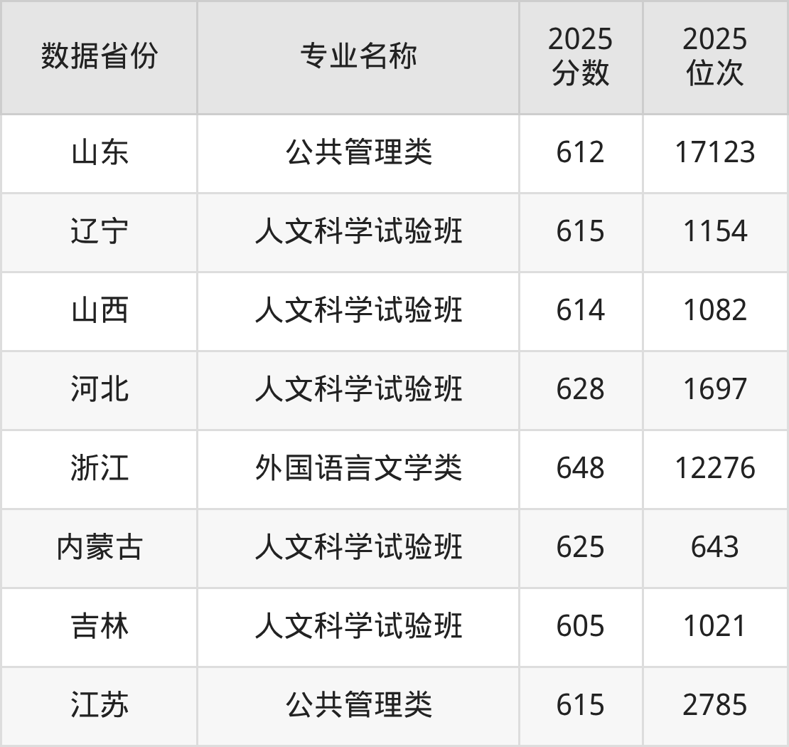 历史类热门专业包括公共管理类、人文科学试验班、外国语言文学类,全国多省最低录取分均在600分以上,报考竞争力较强。东北大学各省历史类热门专业录取分数线及位次如下: