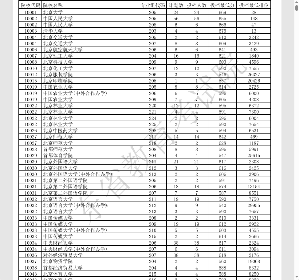 北京大学以669分、位次28的成绩领跑,其205专业组招收24人,涵盖哲学类、经济学类等热门专业。