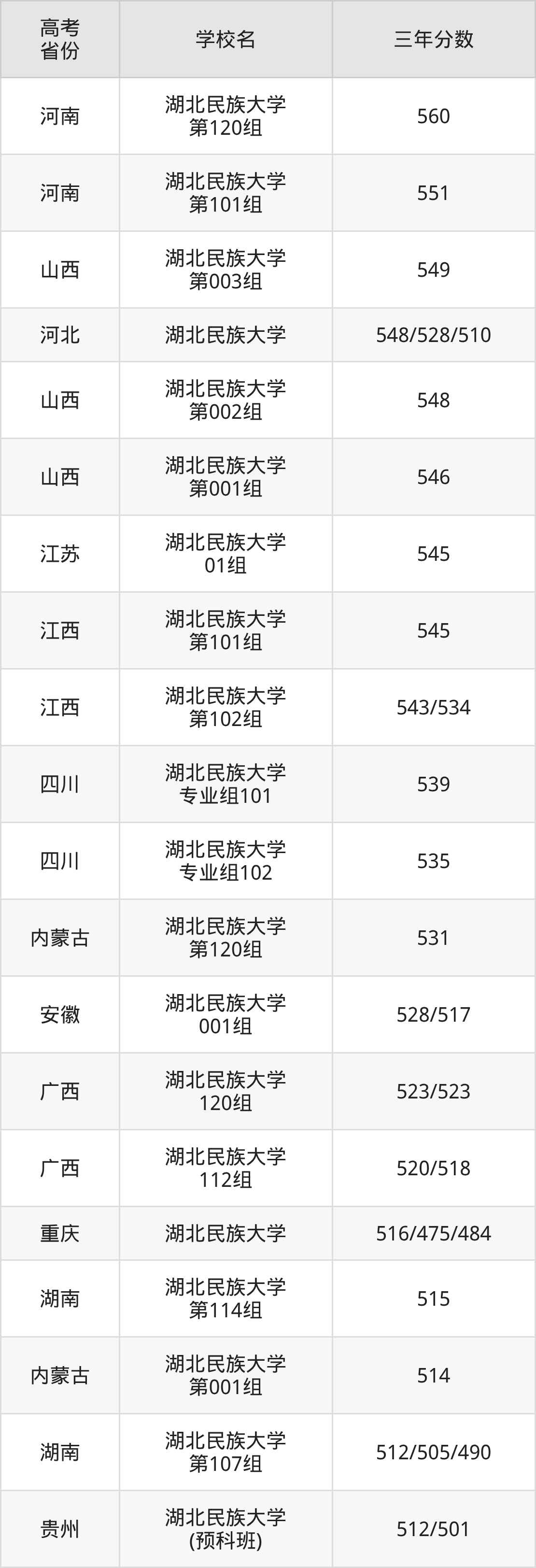| 河北 | 湖北民族大学 | 524/508/494 |