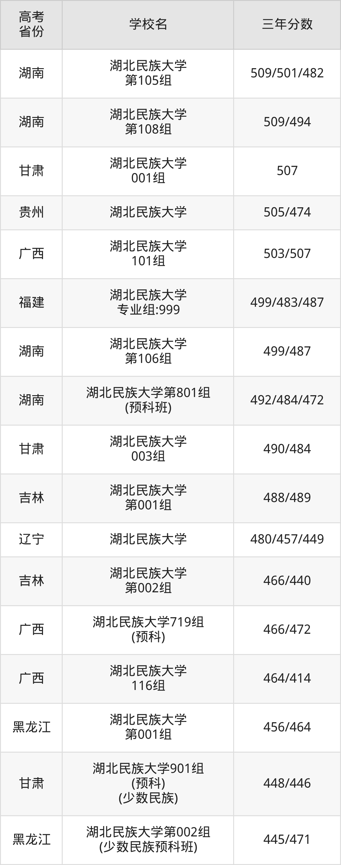 | 湖南 | 湖北民族大学第802组 (预科班) | 470/477/461 |