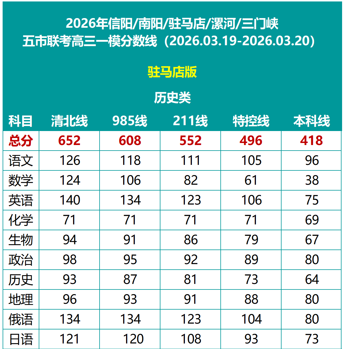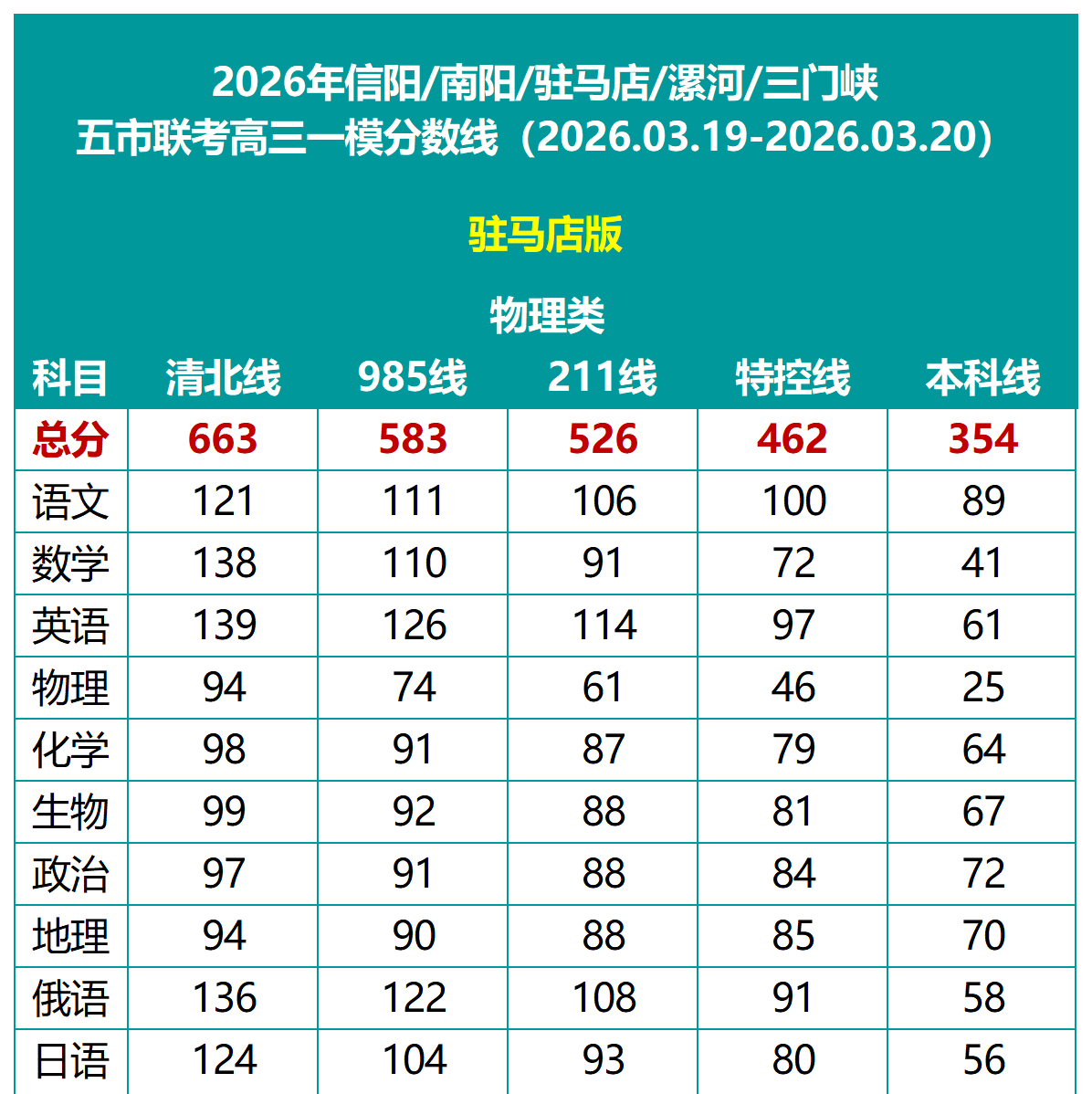 河南五市(南阳、信阳、驻马店、漯河、三门峡)高三一模考试,划定了清晰的一本线和本科线。其中,物理组一本线为462分,本科线为354分;历史组一本线为496分,本科线为418分,这些数据为2026届考生提供了宝贵的参照坐标。