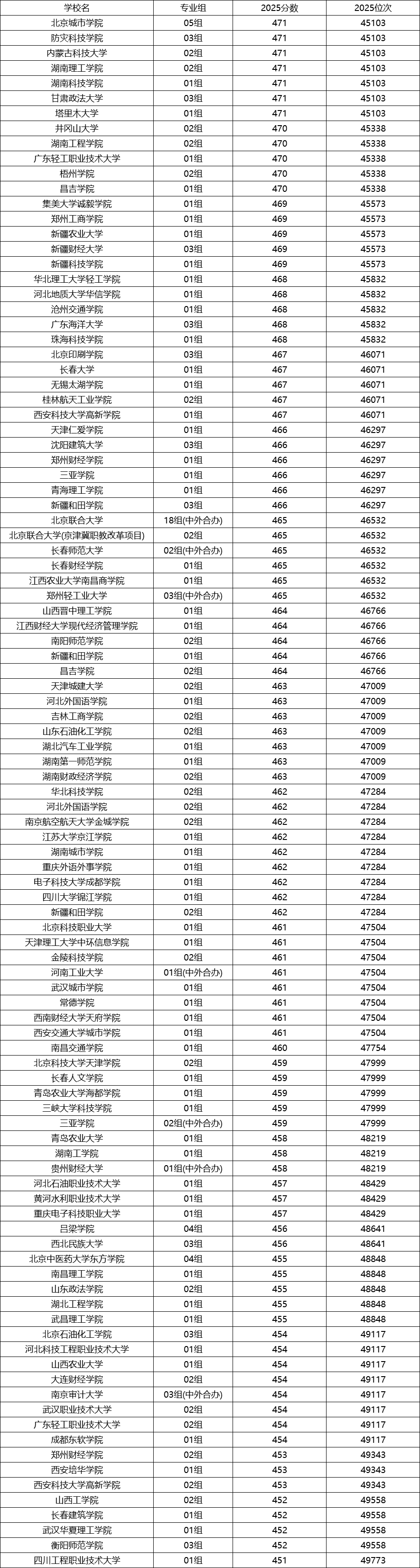 北京高考位次在4.5万至5万名的考生可以选择一些双万计划的大学。根据2025年北京录取分数线,4.5万至5万名考生的分数大约在451分至471分之间,对应的高校包括昌吉学院、天津城建大学、河北外国语学院、吉林工商学院、山东石油化工学院等。