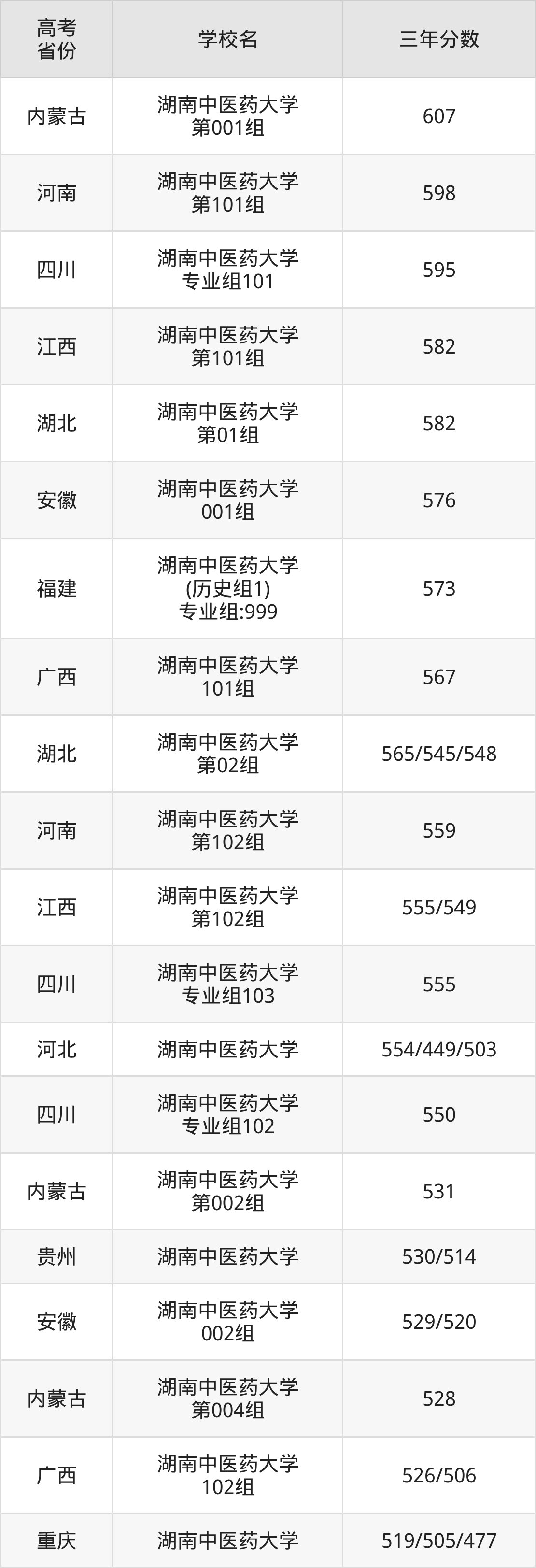 | 重庆 | 湖南中医药大学 | 525/513/477 |