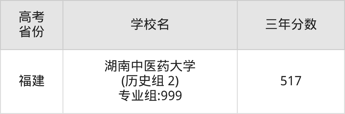 | 福建 | 湖南中医药大学 (物理组1) 专业组:999 | 555 |