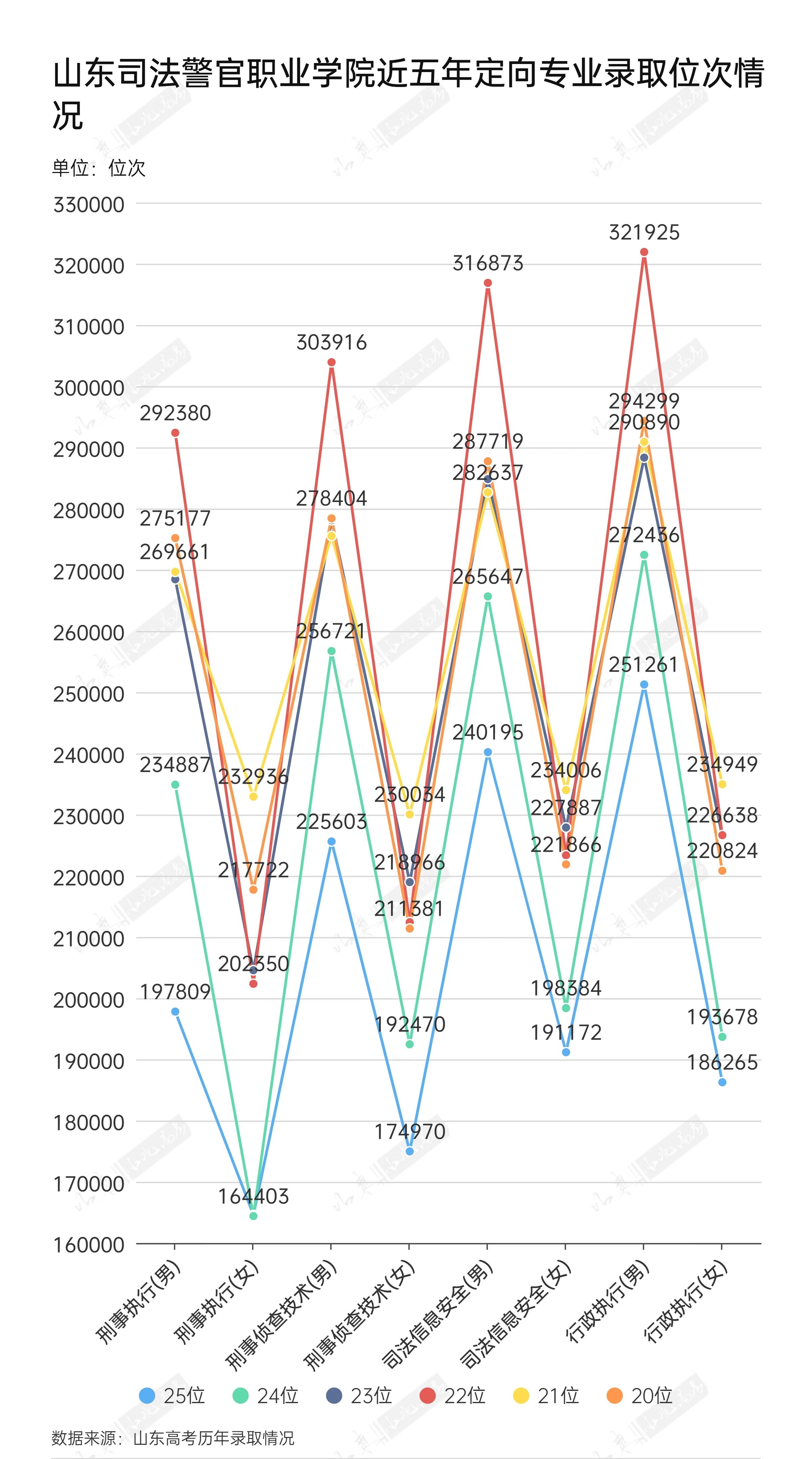从近五年录取位次数据可以看出明显的上升趋势。最低录取位次从早期的33万位左右大幅上升至2025年的16万位左右,五年间位次提升超过50%,表明竞争日益激烈。