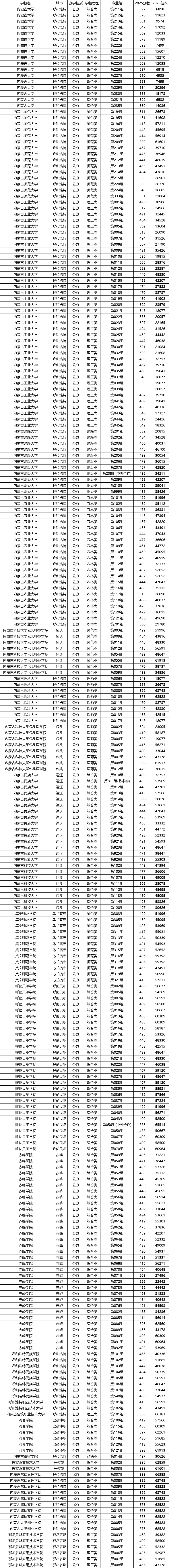 内蒙古自治区内高校在历史类本科批中招生规模大、专业覆盖面广,是多数本地考生的首选。2025年各校录取情况如下: