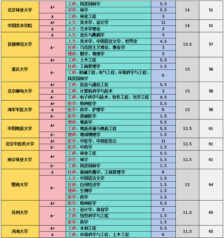 下文将按照学校和学科进行分类汇总:第一类为按学校汇总,将展示全国各院校在第五轮学科评估中获得A类学科的数量排名;第二类则按照专业汇总,展示各个学科评级为A的学校名单,供查阅。