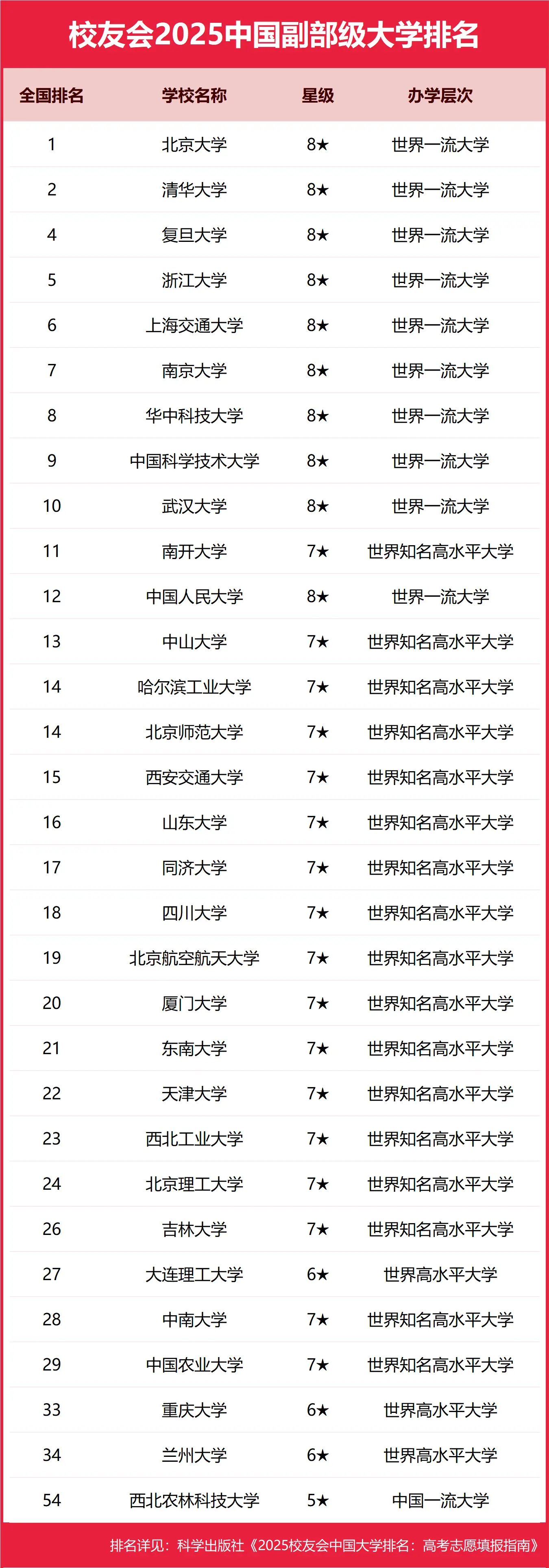 下面将根据2025年校友会最新公布的副部级大学排名,主要分为5个梯队为大家介绍目前32所副部级大学的最新排名情况。