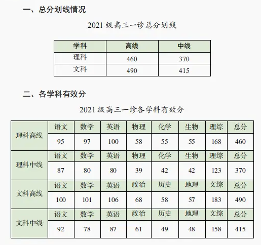 理科一本线(高线)460分,对应全市前30%左右;理科本科线(中线)370分,对应前60%;文科一本线490分,对应前25%;文科本科线415分,对应前50%。