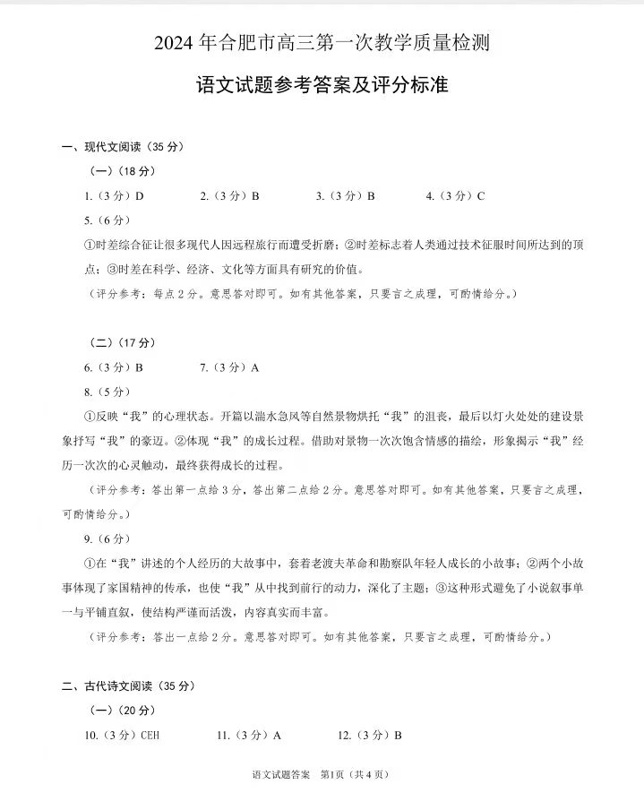一、2024合肥一模语文试题及参考答案