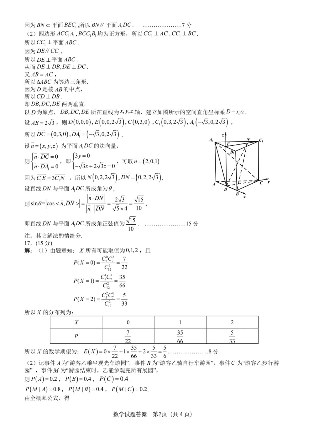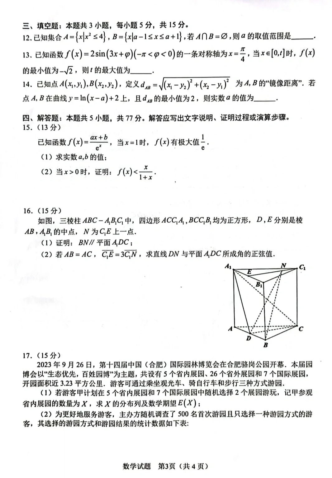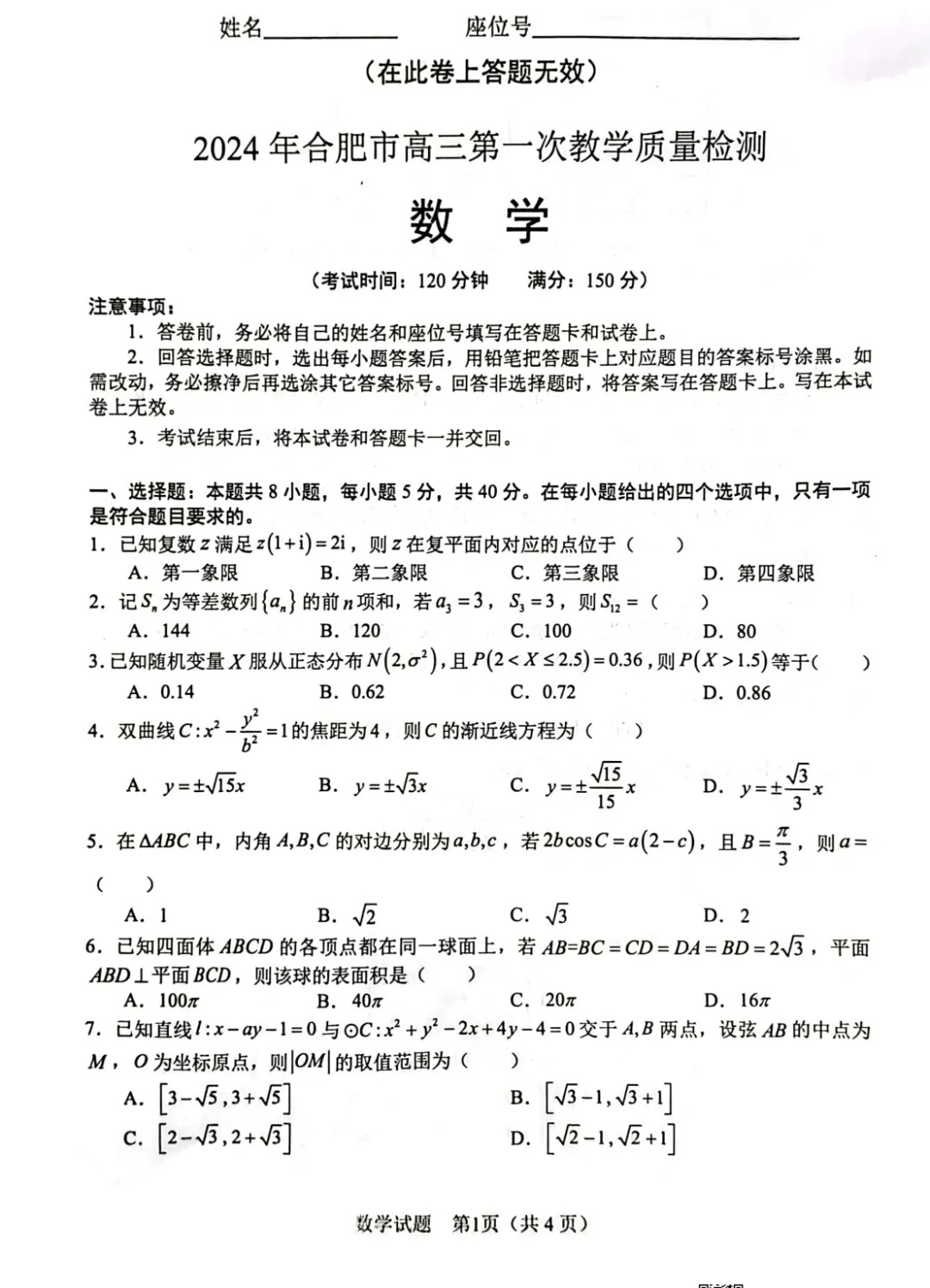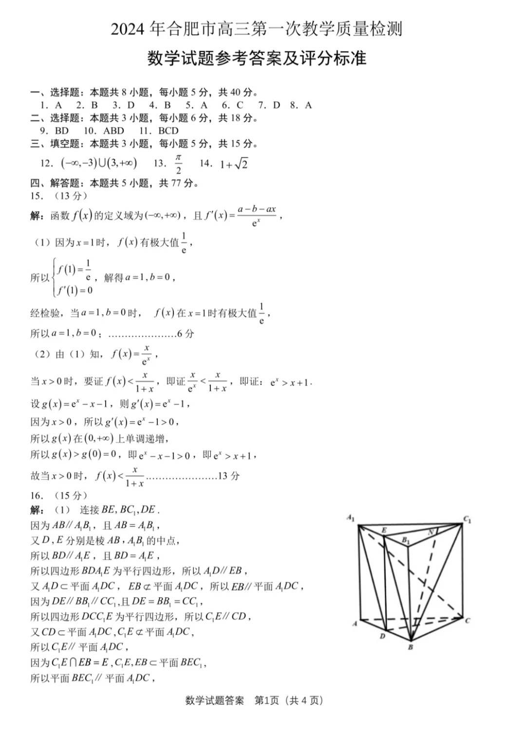 二、2024合肥一模数学试题及参考答案
