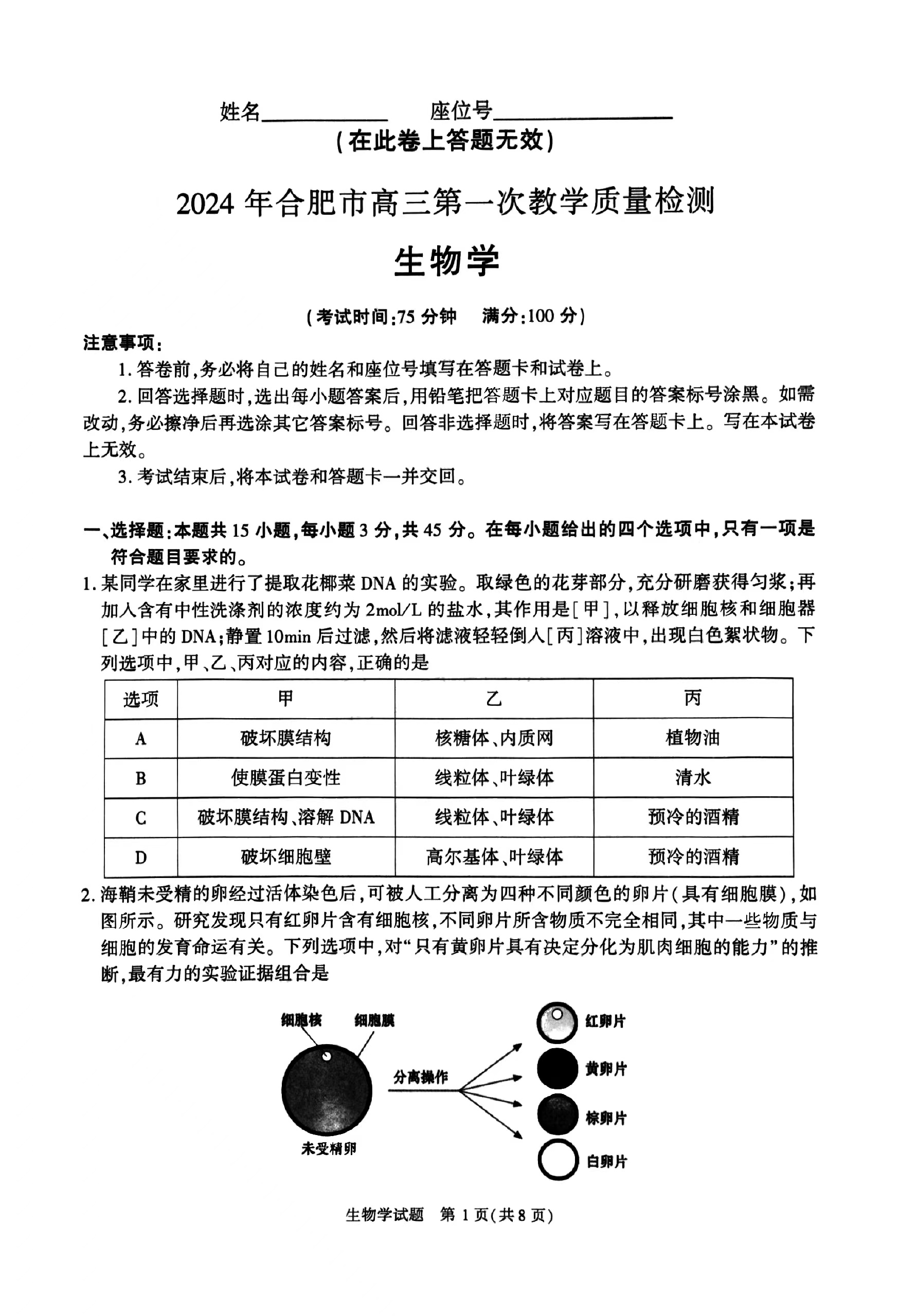 九、2024合肥一模生物试题及参考答案