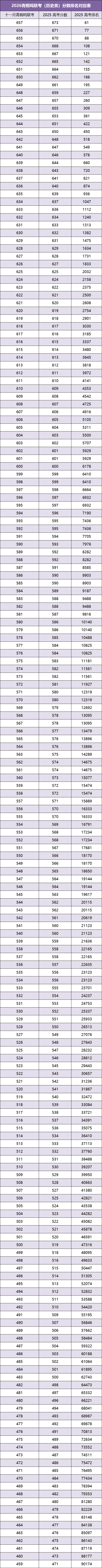 本文通过大数据分析,将联考成绩与往年同水平考生高考成绩及省排名进行匹配,现展示部分分数段对应的省排名情况如下: