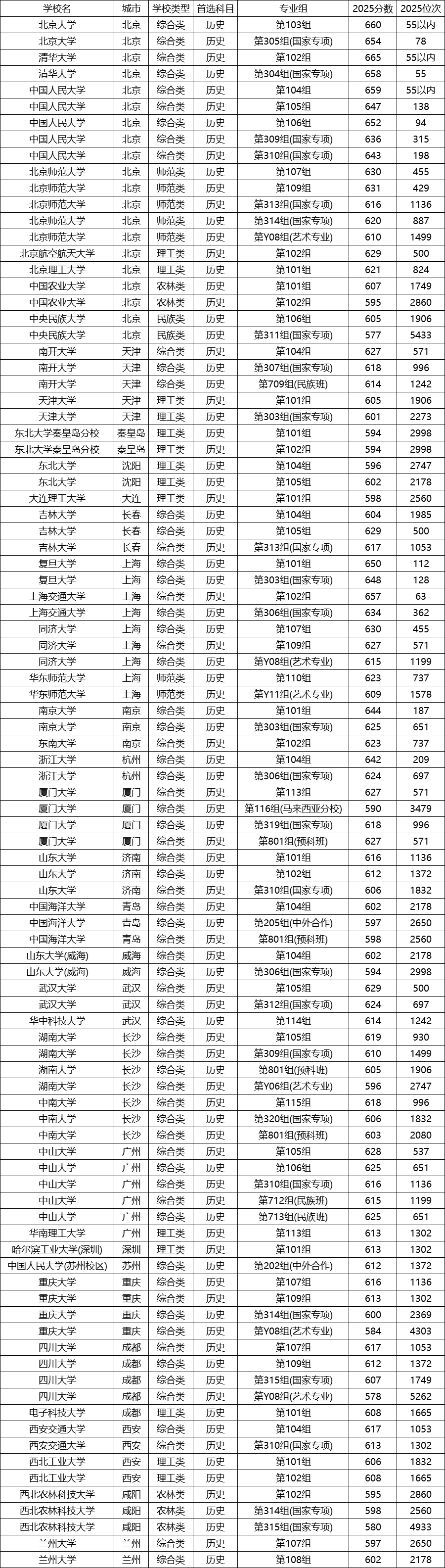 总体情况2025年,湖南历史类考生考入985大学的最低分数为577分,位次约5433位,出自中央民族大学的国家专项专业组。普通专业组的入门分数普遍在590分以上。历史类985院校的分数范围从577分到665分,竞争相对集中,高分段院校数量较少但分数要求极高。