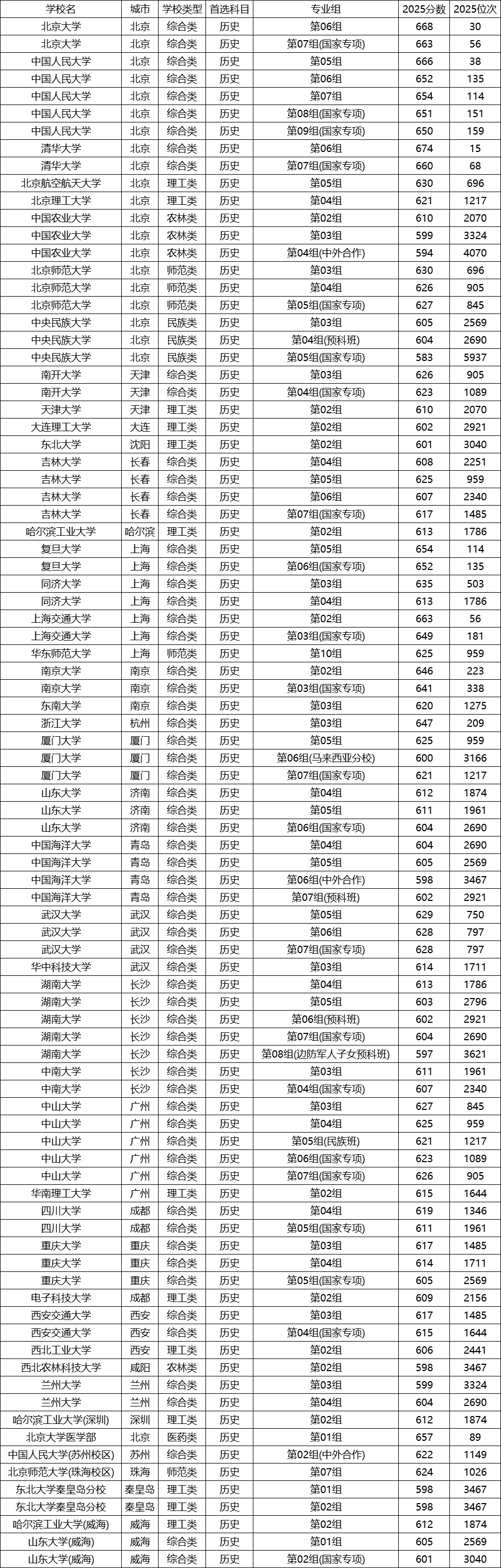中上游985高校的分数线集中在620-650分之间。南京大学646分,位次223名;浙江大学647分,位次209名;武汉大学628-629分,位次750-797名;南开大学626分,北京师范大学630分。这些学校是高分历史类考生的主要目标。