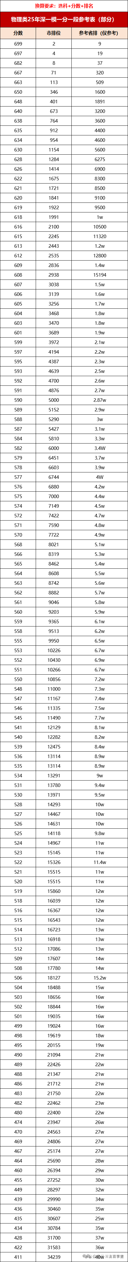 物理类一分一段表显示,699分对应市排第2名,参考省排第9名;600分对应市排346名,参考省排1600名;500分对应市排13971名,参考省排9.5万名;400分则对应市排34239名,参考省排40万名。