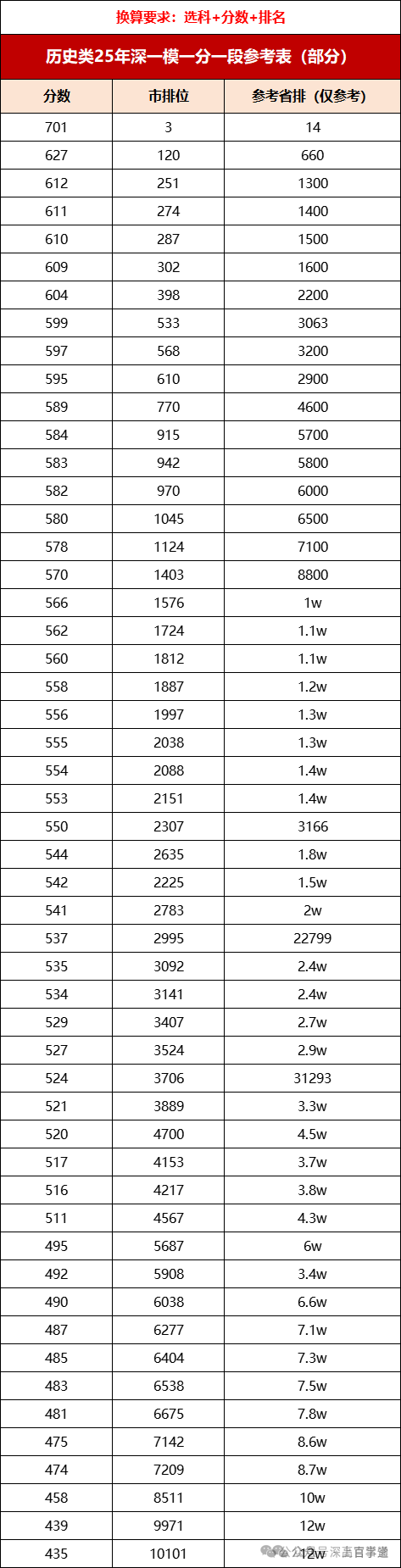 2026年深圳一模的一分一段表暂未公布,考生可先结合2025年的数据进行参考,掌握市排转省排的换算方法,提前定位自己在全省的位置。
