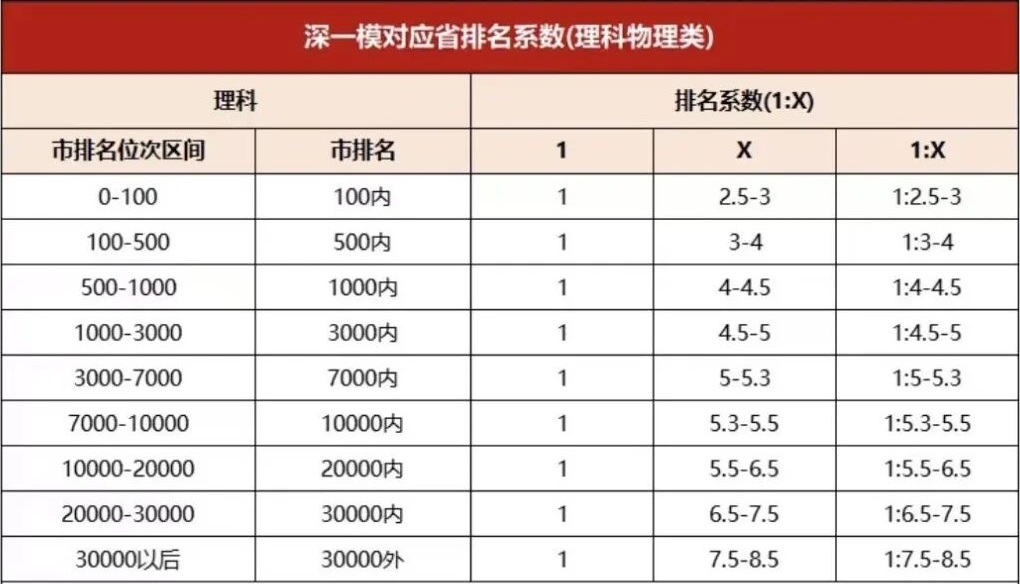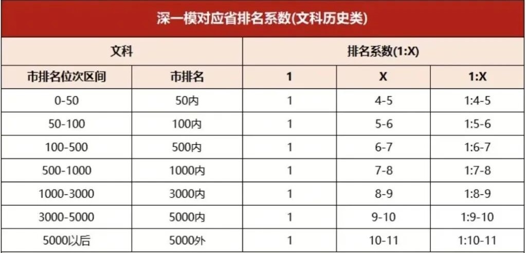 深一模的核心作用之一就是“定位次”,通过深圳市排名可以大致换算出全省排名,从而判断自己在全省考生中的位置。换算的核心是使用排名系数,不同的市排名区间对应不同的系数范围。