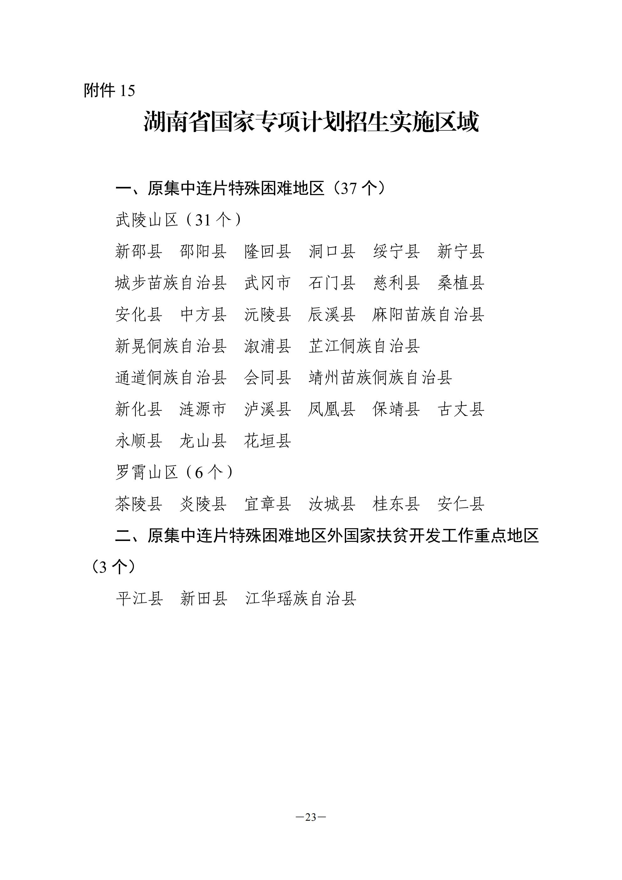 湖南省国家专项计划招生实施区域为原集中连片特殊困难地区县(市)、原国家扶贫开发工作重点县,共计40个县(市),具体名单如下: