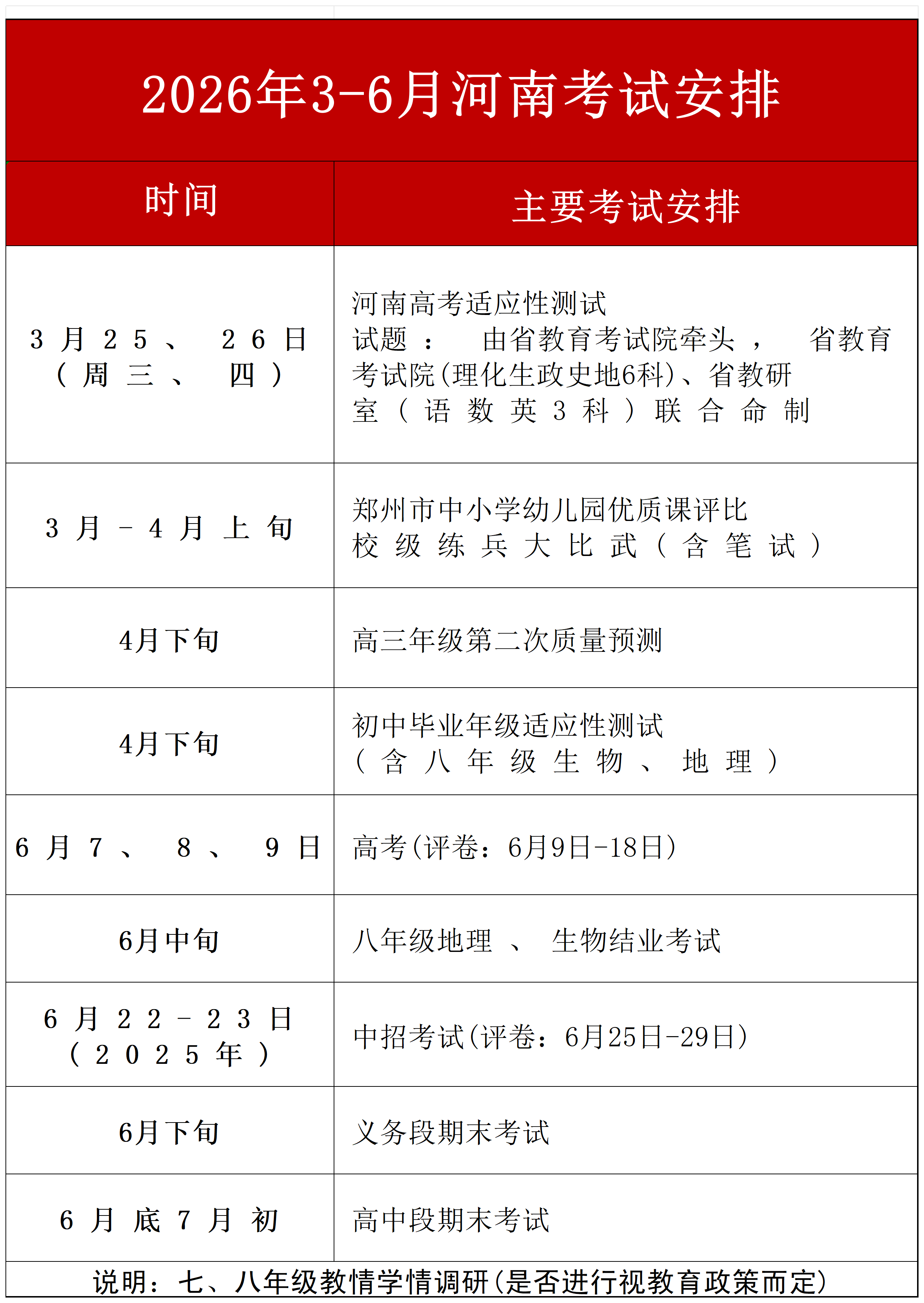 2026年河南新高考适应性考试将于3月25日(周三)、26日(周四)举行,这是新高考改革后的重要模拟考试,直接对接高考命题趋势。同时,根据全年教研与考试计划,高三二模(第二次质量预测)预计在4月下旬进行,为考生的复习备考提供了明确的时间坐标。