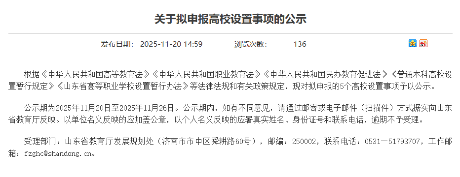 山东省教育厅于2025年11月20日发布了《关于拟申报高校设置事项的公示》。