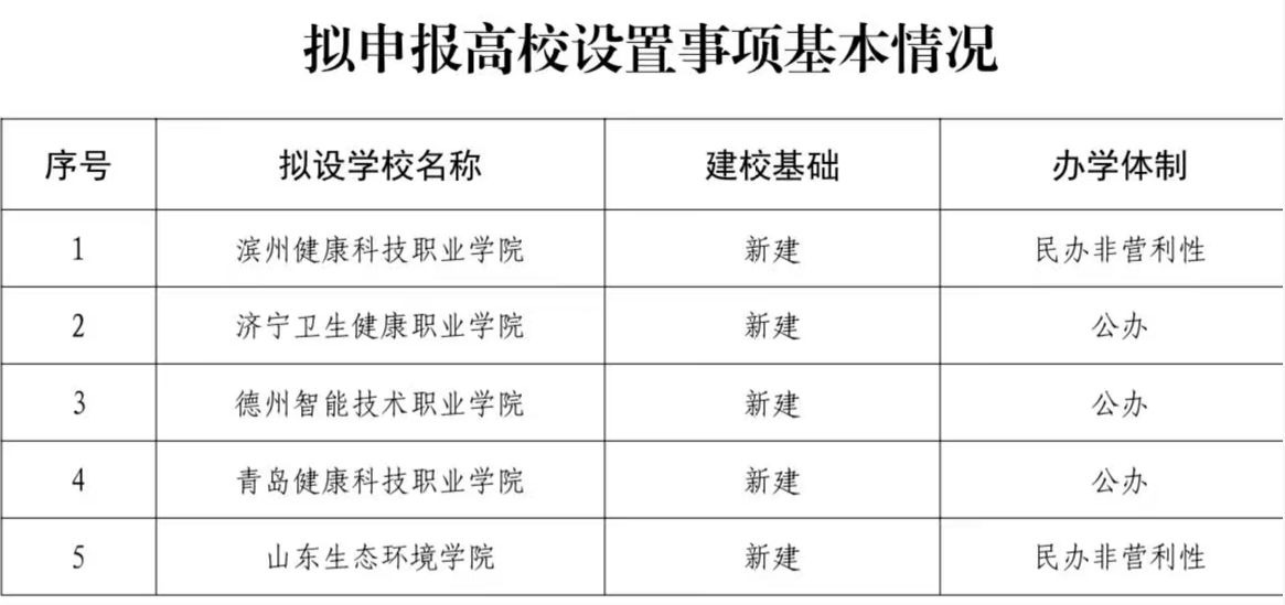 这5所拟新建高校包括:山东生态环境学院(本科)、滨州健康科技职业学院、济宁卫生健康职业学院、德州智能技术职业学院、青岛健康科技职业学院。