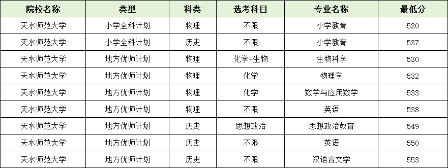 天水师范大学地方优师计划分数普遍高于小学全科计划,尤其是文科方向竞争更明显。