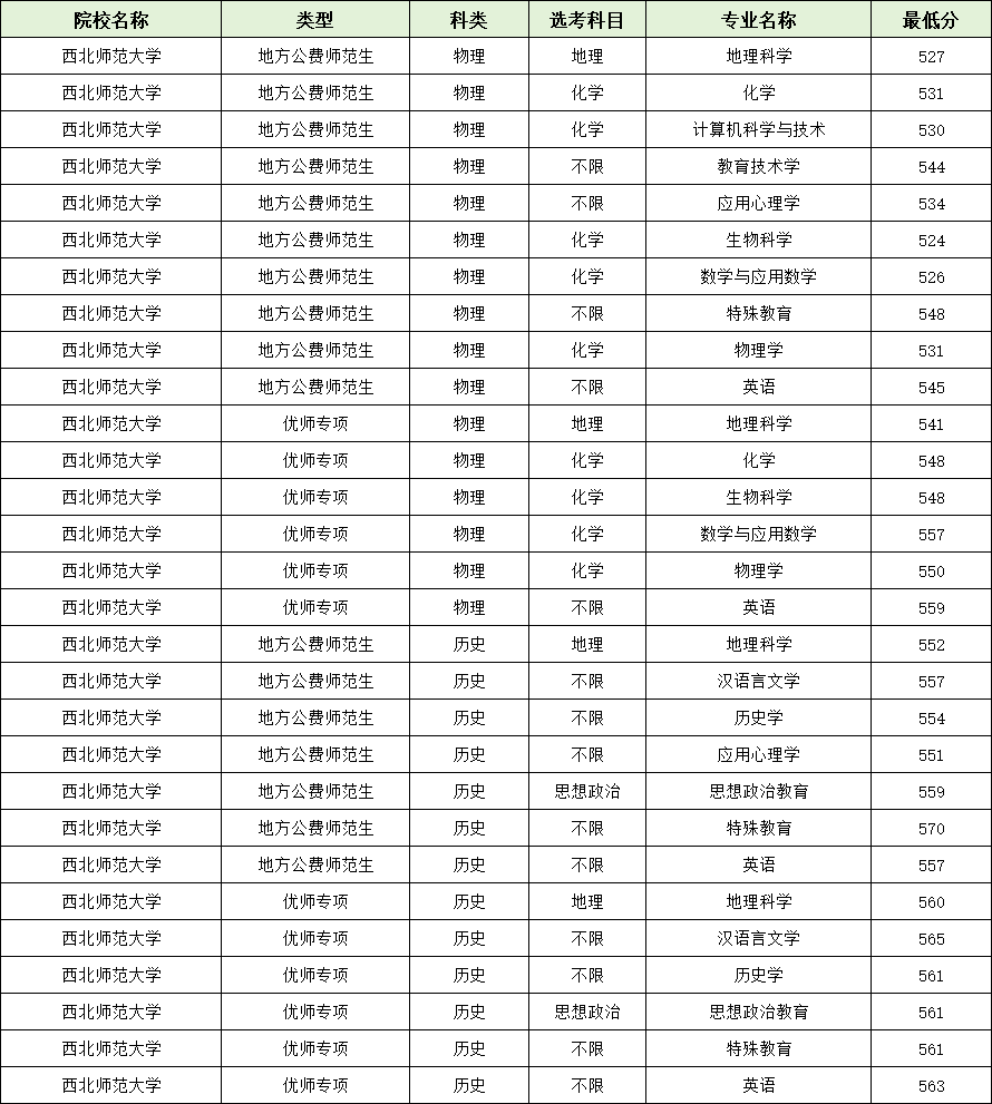 例如,西北师范大学地方公费师范生中,物理类特殊教育专业录取最高分为548分,历史类特殊教育最高达570分;优师专项中,物理类数学与应用数学录取分为557分,历史类汉语言文学录取分为565分,整体竞争激烈。