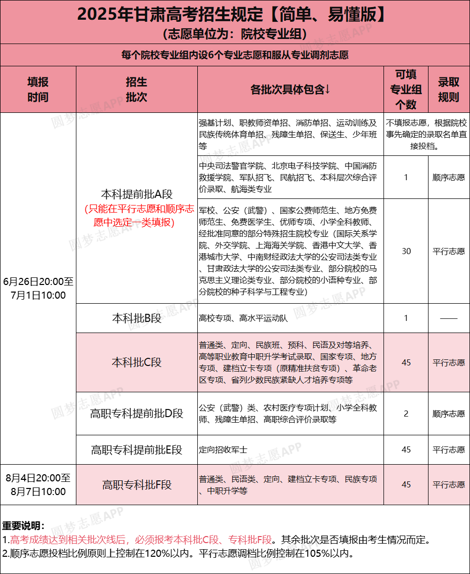 2026年甘肃本科提前批A段(军校、公安(武警)、国家公费师范生、地方免费师范生、免费医学生、优师专项、小学全科教师、经批准同意的部分特殊招生院校专业)、高职专科提前批E段的录取规则是平行志愿;甘肃本科提前批A段(中央司法警官学院、北京电子科技学院、中国消防救援学院、军队招飞、民航招飞、本科层次综合评价录取、航海类专业)、高职专科提前批D段的录取规则是顺序志愿。下文将为大家详解!