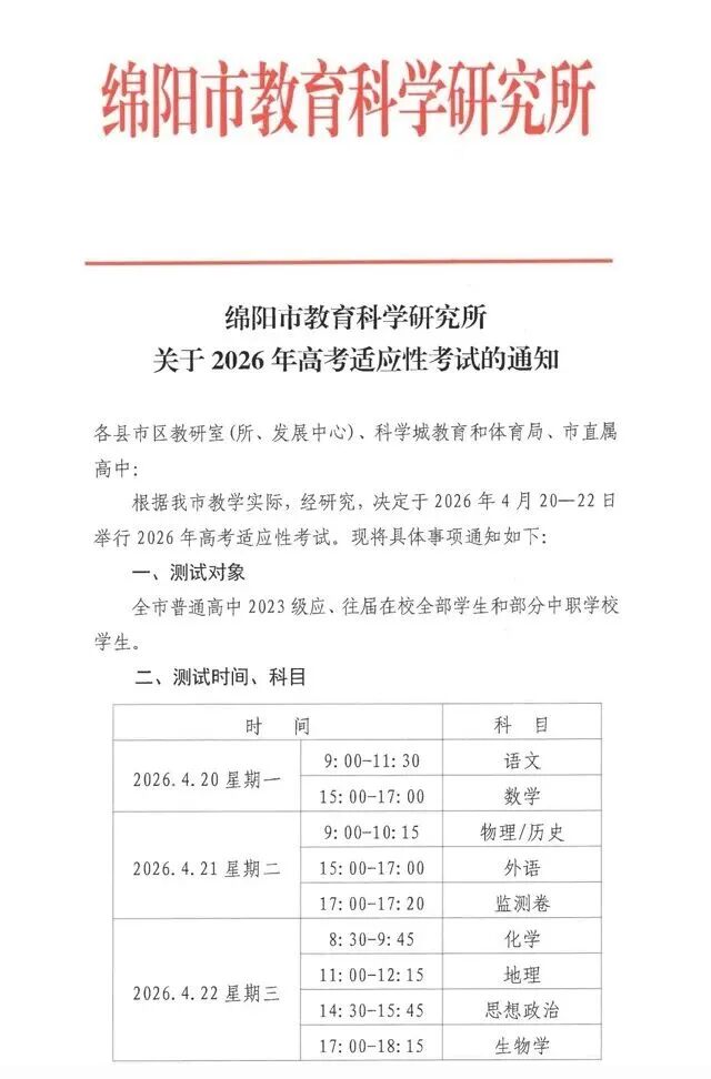 根据绵阳市教育科学研究所通知,2026年高考适应性考试(即“三诊”)具体安排如下: