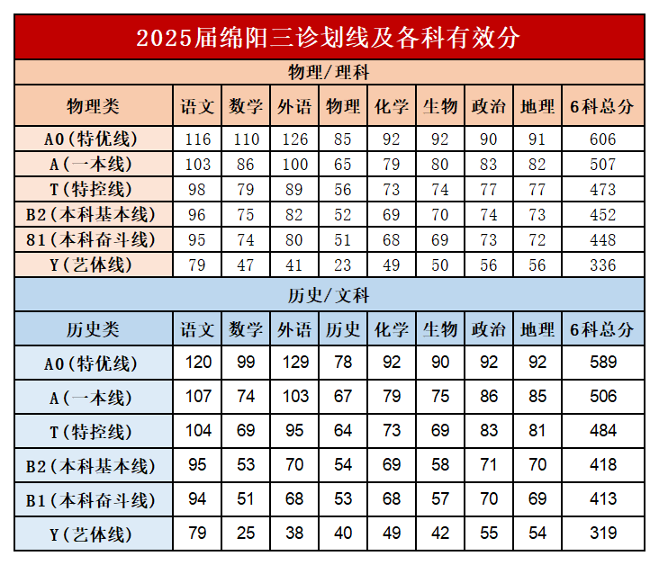为帮助大家利用本次三诊成绩进行定位,下面回顾2025届绵阳三诊的划线情况(物理类和历史类)。请结合你的估分,对比以下分数线,了解自己目前处于哪个层次。