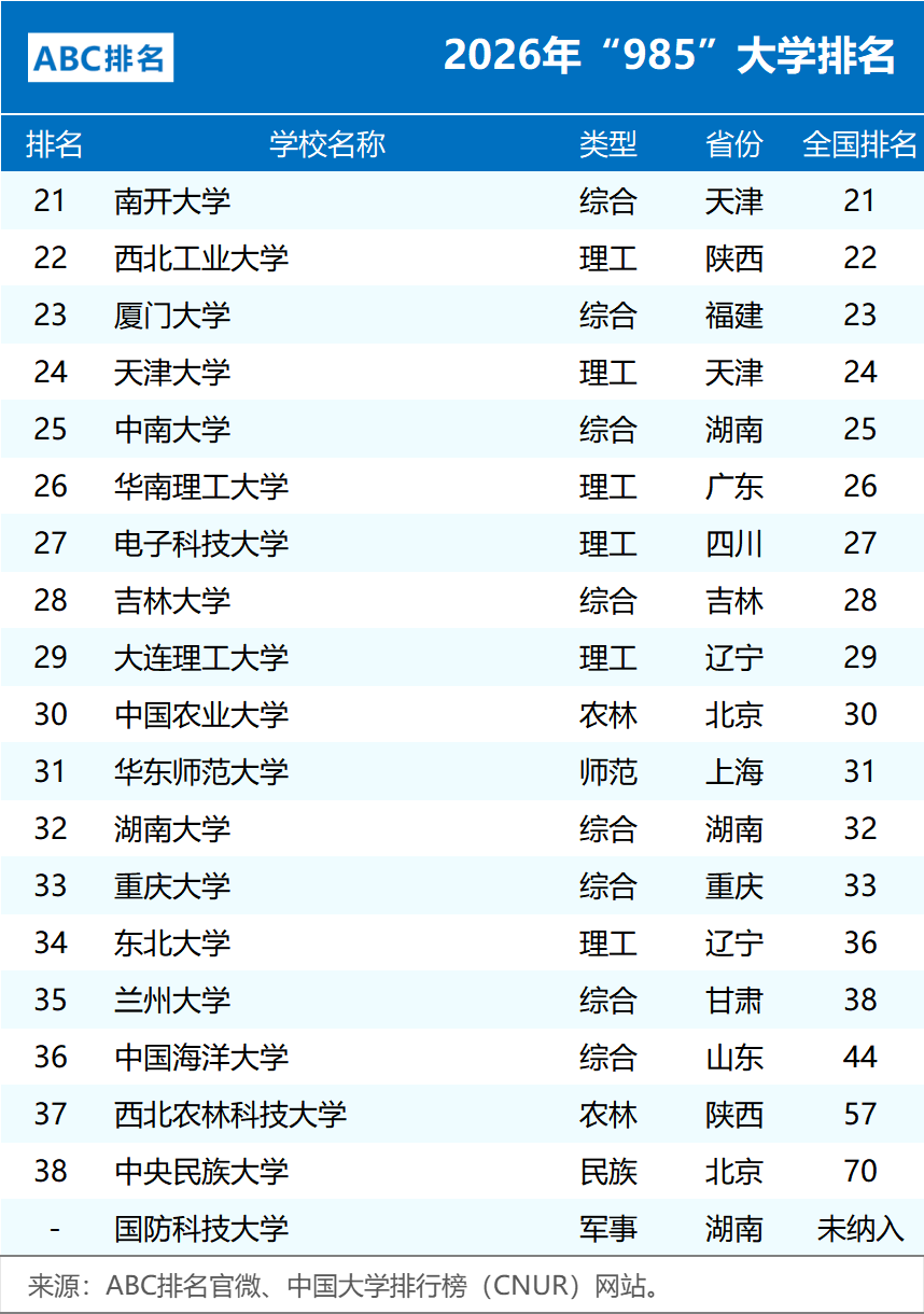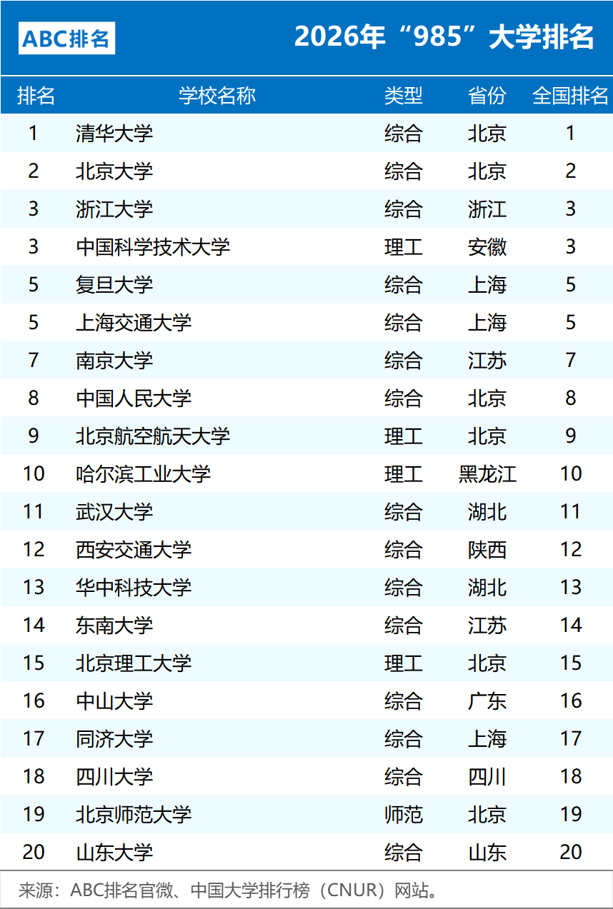 2026年985大学排名由ABC排名与中国大学排行榜(CNUR)共同发布,共涵盖39所高校(国防科技大学未纳入排名)。整体来看,顶尖高校格局保持稳定,中游高校竞争激烈,部分院校排名出现明显变动。具体来看: