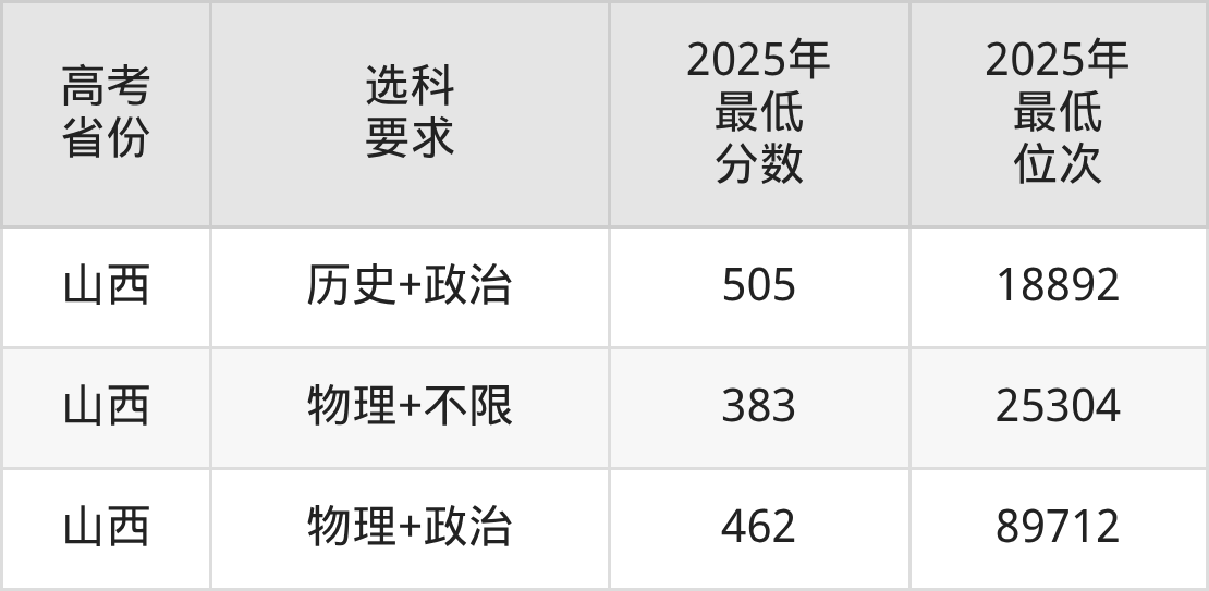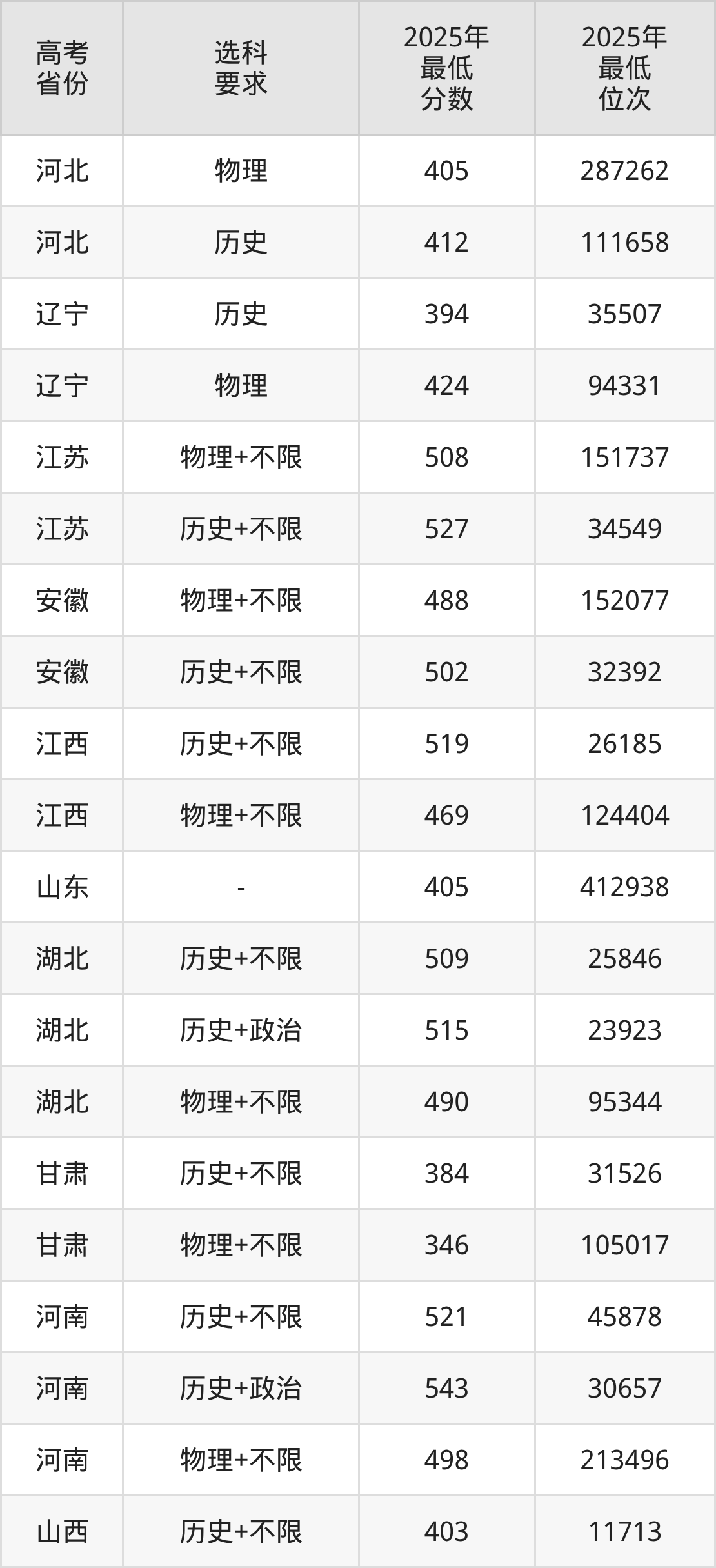 在2025年山西高考物理类招生时,211收分最低的是东北林业大学第304组(国家专项计划),最低分是448分、位次是100390位。再看山西工程科技职业大学,2025年在山西物理类的最低录取分数线是383分,最低位次是25304位。