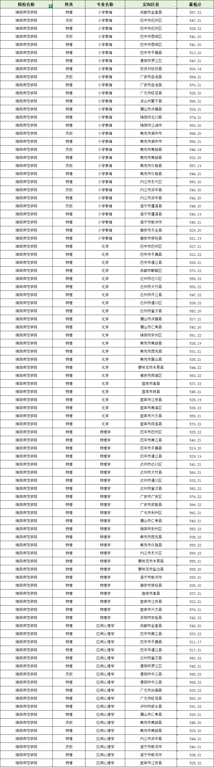 定向至绵阳市北川县,小学教育(师范)574.21分